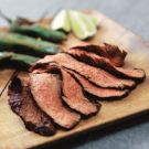 Latin American carne asada, or "grilled meat," typically starts with tough but tasty flank steak, which is tenderized, moisturized and flavored with a bold marinade. On the grill, it becomes a rich medium brown on the outside and juicy and pink on the inside. When served, it is sliced across the grain, further enhancing its tenderness.