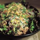 Line a platter with the lettuce leaves. Top with the pork and noodles, garnish with the peanuts, mint and cilantro and serve. Serves 4.