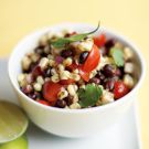 When the corn is cool enough to handle, remove the kernels from the cobs and place the kernels in a large bowl. Add the black beans, chopped cilantro, tomatoes, jicama, onion and vinaigrette and stir until well combined. Garnish with the cilantro leaves. Serve the salad at room temperature. Serves 6 to 8.