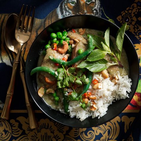 Born in Bangkok and raised in Seattle, acclaimed chef Max Borthwick, along with his mother, Toi, co-owns Thaifusions, where they transform their family recipes for Thai curries and peanut sauces into handcrafted packaged products. Here, we use their green curry sauce, which combines coconut milk with fresh herbs and spices, for a quick yet impressive Thai dinner. If you don’t have cilantro on hand, basil or Thai basil would make an excellent substitution.