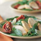 Place the arugula in a large bowl, drizzle with the remaining 4 Tbs. olive oil and toss to coat evenly. Sprinkle with the vinegar, the 1/4 tsp. salt and a pinch of pepper and toss again. Arrange the arugula on plates. Cut the chicken on the diagonal into slices and place on the arugula. Garnish with the roasted tomatoes, top with the cheese and serve immediately. Serves 4.