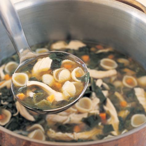 Add the pasta and chicken to the pan and return to a boil. Cook, stirring often, until the pasta is not quite al dente (tender but firm to the bite), about 3 minutes, or according to the package instructions. Stir in the chard and cook until wilted, about 1 minute. Season with salt and pepper. Ladle the soup into bowls and serve immediately. Pass the cheese at the table. Serves 4.