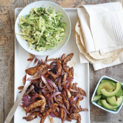 Transfer the chicken and onions to a warmed platter. Serve with the warm tortillas, cabbage slaw and avocado, allowing diners to fill tortillas with chicken and onions, then cabbage and avocado. Serves 4.