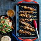 Place the skewers on the grill pan and cook, turning once, until grill marked on the outside and opaque throughout, 6 to 8 minutes total. Meanwhile, pour the peanut sauce remaining in the jar into a serving dish. Serve the chicken hot, with the peanut sauce alongside for dipping. Serves 4.