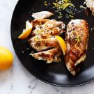 Transfer the chicken breasts to a platter and cover loosely with aluminum foil. Let rest for 5 minutes. Cut each chicken breast on the diagonal into thick slices and serve immediately. Serves 2 to 4.