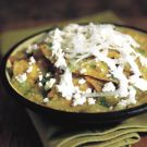 Scoop the mixture into a warmed serving dish or onto warmed individual plates. To garnish, spoon on the crema and scatter the onion rings and cheese on top. Serves 4.