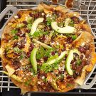 Remove the tray from the grill and top the nachos with the avocado, cilantro and cotija. Drizzle with salsa and serve immediately. Serves 10 to 12.