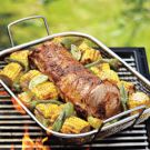 Place the pork on the grill over direct heat and sear until grill-marked on all sides, 7 to 8 minutes total. Transfer the roast, tied side down, to the center of a mesh roasting pan and set over indirect heat. Cover the grill and cook for 30 minutes, maintaining the internal temperature of the grill at 400° to 425°F.