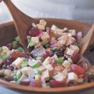 You may use 3/4 lb. boneless, skinless cooked turkey breast in place of the chicken. For a light summertime supper, serve the salad atop leaves of green-leaf lettuce with a basket of warm buttermilk biscuits.