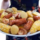 Brimming with seafood, smoked sausages, potatoes and corn on the cob, this hearty one-pot stew is tailor-made for a crowd. If you’d like, replace the clams with two dozen blue crabs, adding them to the pot at the same time as the corn. You will need a very large pot for this recipe. A lobster pot with a 4-gallon capacity works well.