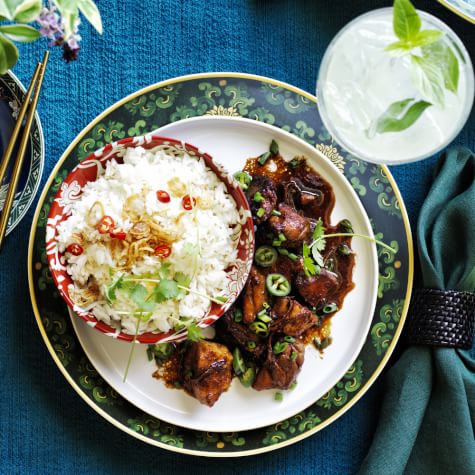 Spoon some rice into individual bowls and top with the chicken and braising sauce. Garnish with the green onion, jalapeño and cilantro, if desired, and serve immediately. Serves 2 to 4.
