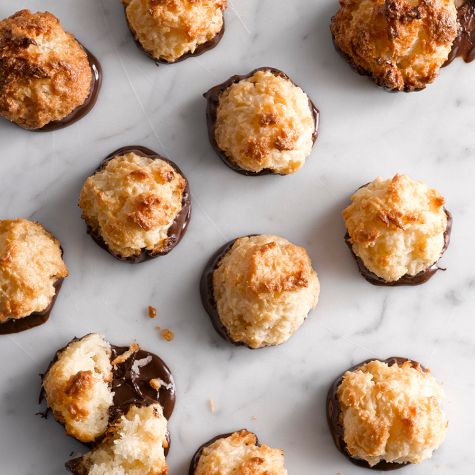In a clean, dry bowl set over a pan of simmering water, melt the chocolate. Dip the bottom of each macaroon in the chocolate and set the cookies on the prepared baking sheet. Refrigerate until the chocolate is set, 5 to 10 minutes. Makes about 30 cookies.