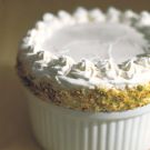 When ready to serve, using a balloon whisk or an electric mixer on medium-high speed, beat the remaining 1⁄2 cup cream in a chilled bowl until stiff peaks form. Carefully remove the collar from the soufflé and spread half of the whipped cream over the top. Spoon the remaining cream into a pastry bag fitted with a small star tip and pipe rosettes of cream around the edge. Gently press the pistachios into the sides of the soufflé and serve. Serves 4 to 6.