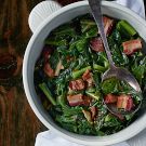 Increase the heat to medium-high, add the collards and stock and simmer until reduced by half, about 4 minutes. Stir in the smoked onion jam, lardons, salt and pepper and serve immediately. Serves 8.