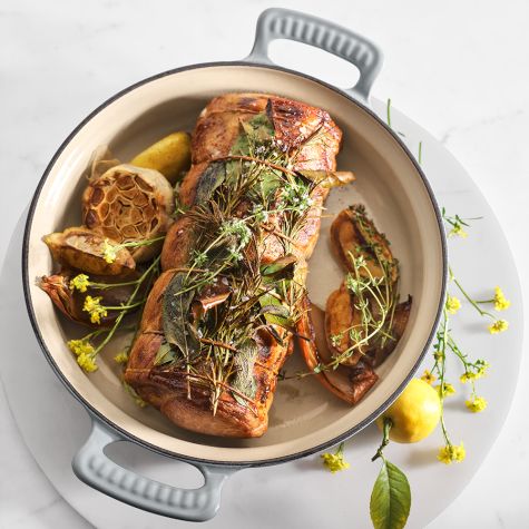 Season the loin with pepper. Arrange the sage, rosemary, thyme and bay leaves all over the roast, securing the sprigs here and there under the strings. Return the seared roast to the roasting pan. Add the garlic, onion and lemon to the pan and drizzle everything generously with olive oil. Season the aromatics with salt and pepper.