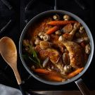 Quintessentially French, coq au vin is typically cooked with red wine, traditionally a bottle of Burgundy. Here, however, we’ve used a dry white wine instead, which results in a brighter flavor. A splash of dry sherry adds a depth of flavor. If you can’t find small button mushrooms, simply use larger ones and cut them into halves or quarters.
