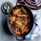 A traditional dish of Burgundy, coq au vin is perfect for both cozy Sunday suppers and small dinner parties. This version calls for bone-in chicken thighs and drumsticks, which emerge exceptionally moist and tender after long, slow cooking in a Dutch oven.
