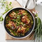 To achieve beautifully crisp skin on chicken thighs, we sear them in a nonstick fry pan, then roast them on a baking sheet in a hot oven. Meanwhile, we quickly cook a medley of fresh spring vegetables in the same fry pan, enriching everything with a light butter and white wine sauce. A bit of bacon lends salty-savoury goodness to the dish.
