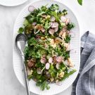 Our nontraditional take on the Laotian dish nam khao—which typically features crisp rice, grated coconut and pungent seasonings wrapped up in lettuce leaves—this dish has a similarly toothsome texture but also highlights spring vegetables and tender herbs for a refreshing seasonal salad that is a perfect pairing with poultry or seafood. The shallot and radishes should be sliced as thinly as possible, so we suggest using a mandoline.
