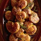 To serve, transfer the potatoes to a warmed serving bowl. Top with the chopped rosemary, thyme and parsley and garnish with the fried rosemary sprig. Serve immediately. Serves 10 to 12.