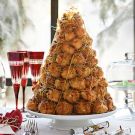 To assemble the dessert, carefully dip the bottom of a cream puff into the warm caramel, being careful not to burn your fingers. Place the cream puff, caramel side down, along the edge of a 10-inch (25-cm) cake stand. Continue dipping the cream puffs in the caramel and arranging them in a large circle around the edge of the cake plate. Arrange a second circle of cream puffs on top of the first, making the second circle slightly smaller than the first so that you are forming a cone-shaped tower. Continue in this way until the final layer consists of a single puff on top of all the others.