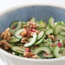 The crunchy, slightly bitter walnuts blend beautifully with the sweet-sharp pomegranate seeds and cooling cucumber in this very refreshing salad. It’s a lovely meze dish but also goes particularly well with grilled halloumi, or any fish or poultry.