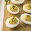 A fragrant medley of sweet and spicy seasonings, hot curry lends a moderate level of heat to these deviled eggs and helps to cut the richness of the eggs. Organic eggs, with their buttery orange yolks, yield a particularly attractive and flavorful filling.