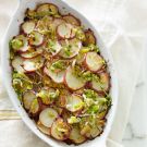 Transfer to the oven and bake until the potatoes are tender and the tops are golden brown, about 40 minutes. Let cool for 10 minutes before serving. Serves 8.