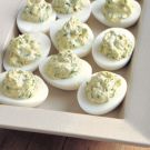 Arrange the egg whites on a serving platter. Using a small spoon, divide the egg yolk mixture among the egg whites, mounding the mixture slightly in the centers. Serve right away. Makes 12 deviled eggs; serves 4 to 6.