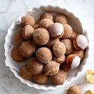 In a small microwave-safe bowl, melt the 6 Tbs. (3 oz./90 g) butter and let cool slightly. Put the cinnamon-sugar in a medium bowl. While the donut holes are still slightly warm, dip the top half into the melted butter and then into the cinnamon-sugar. Alternatively, dip the entire donut hole into the butter and cinnamon-sugar.