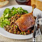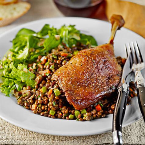 In a large nonstick fry pan over medium-high heat, warm 1 cup of the reserved oil. When the oil is hot, add the duck legs, skin side down, and cook until the skin is browned and crispy, 3 to 5 minutes. Turn the duck legs over and cook until browned on the other side, 2 to 3 minutes. Transfer to the rack-lined baking sheet to drain. Serve the duck legs warm with braised lentils. Serves 8.