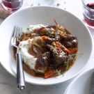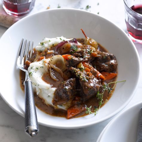 Although preparing beef bourguignonne can be a lengthy process, using a slow cooker and our flavorful braising sauce results in a delicious meal with a minimum of hands-on prep time. Boiled or steamed new potatoes rolled in butter and herbs are the traditional accompaniment for sopping up the savory sauce, but we also like serving it with chive-flecked mashed potatoes.