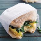 Remove the ramekins from the oven and let cool slightly. Carefully run a paring knife around the inside edges to release the eggs. Turn out each egg portion onto a muffin, on top of the melted cheese. Mound equal portions of the spinach over the eggs and then cover with the muffin tops. Eat immediately, or wrap loosely in waxed paper and take to go. Serves 2.