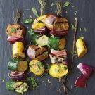 Mix and match pieces of summer squash, eggplant and red onion on bamboo skewers to create colorful seasonal kabobs. Or, use sturdy rosemary branches in place of the skewers for an even prettier presentation. When the kabobs come off the grill, stack them on a big platter and let guests help themselves to both the skewers and the fragrant herb sauce.