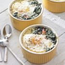 Here, eggs are baked in a nest of spinach, prosciutto and cream for a presentation that is elegant enough for brunch entertaining. For the soft-cooked egg lover, it’s a heavenly combination. Serve with toasted bread or English muffins for dipping into the buttery yolks.