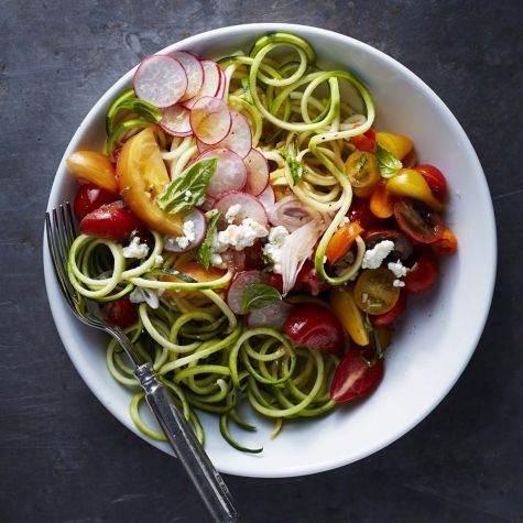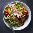 Trim the ends off the zucchini and summer squashes. Using a spiralizer fitted with the small shredder blade, cut the zucchini and squash into spaghetti-like spiral strands, using kitchen shears to cut the curls every 3 or 4 rotations.
