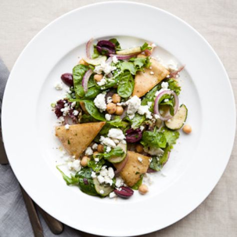 In a large bowl, toss together the greens, cucumber, onion, chickpeas, olives, cheese and pita triangles. Toss with the vinaigrette to taste and serve immediately. Serves 4.