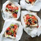 To close the packets, gather together 2 sides of the parchment paper and fold the edges over. Tuck the remaining 2 sides of the parchment paper under the fish. (Do not seal the packet too tightly because enough air needs to circulate to steam the fish. The seal should be just tight enough so that steam doesn’t escape.) Repeat to make 3 more packets.