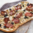 This beautiful flatbread is inspired by ingredients from the Mediterranean. The feta adds a salty, slightly tart taste that balances the sweet, smoky flavors of the oven-roasted tomatoes. Cut it into pieces and serve as an appetizer with a light, fruity white wine, such as Albariño or Pinot Grigio.