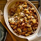 Transfer the stuffing to the prepared baking dish. Cover with a lid or a buttered sheet of aluminum foil and bake for 20 minutes. Remove the lid or foil and continue baking until the top is golden brown and crisp, 25 to 35 minutes more. Let rest for 10 minutes before serving. Serves 10 to 12.