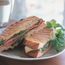Working in batches if necessary, place the sandwiches on the panini press, then place the weighted lid on top. Reduce the heat to medium-low. Cook until the undersides are golden, about 2 minutes. Turn the sandwiches over, weight them down again and cook until golden on the other side, about 2 minutes more.