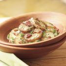 We put a new twist on the classic potato salad. The potatoes are cooked in a pressure cooker until almost tender, then fried in bacon fat until brown and crispy. A sprinkling of crumbled bacon adds a savory crunch. This hearty salad is the perfect partner for barbecued ribs or grilled meats.