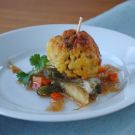 To assemble, insert a toothpick through 1 fish ball, 1 artichoke slice and a fiddlehead, and spoon some of the sauce from the fish on top. Garnish with cilantro and serve immediately. Serves 16.