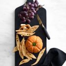 These ghostly crackers are just the thing for Halloween gatherings and are guaranteed to fly off the platter. They’re a snap to make using pie dough—and to streamline prep, you can use store-bought dough instead of preparing it from scratch. To accompany the crackers, we created a clever cheese ball that resembles a pumpkin.