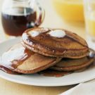 For each pancake, ladle about 1/4 cup batter onto the hot surface. Reduce the heat to medium-low and cook until small bubbles appear and the edges start to look dry, about 4 minutes. After 3 minutes, lift a pancake to check if the underside is done; do not let the pancakes darken too much. Carefully turn the pancakes over and cook until lightly browned on the other side, about 1 minute more. Transfer to an ovenproof platter and place in the oven to keep warm; do not cover the pancakes or they will get soggy. Repeat with the remaining batter and butter to make about 8 pancakes, each about 4 inches in diameter. Serve the pancakes immediately, accompanied by the syrup. Serves 4.