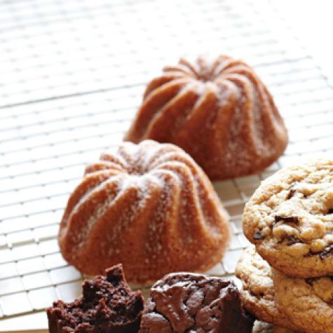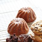 Using a serrated knife, gently saw off any portion of each cakelet that rose above the edge of the pan. Tap the pan gently on a work surface to loosen the cakelets. Place a wire rack over the top of the pan, invert the pan onto the rack and lift off the pan. Let the cakelets cool completely, 1 to 2 hours. Dust with confectioners’ sugar just before serving. Makes 6 cakelets.