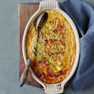 Michael Sullivan, Butcher at Blackberry Farm, says this dish was inspired by a corn pudding that his grandmother made. He adds guanciale, an unsmoked Italian bacon made from the pig’s jowl, to the batter before baking, although thick-cut bacon is a great stand-in. When fresh corn is in season, you can fold in kernels cut from the cob; they lend wonderful texture and flavor. If you’d like, place a few whole green onions on top of the batter before baking.