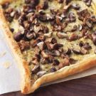 On a floured work surface, roll out the puff pastry into a rectangle 10 by 12 inches wide and 1/8 inch thick. Transfer the dough to the prepared baking sheet. Spread the leek mixture to within 1 inch of the edge of the dough, and fold the edges of the dough over the filling to make a free-form tart. Bake until the crust puffs and both the crust and the leeks are golden, about 15 minutes. Scatter the mushrooms over the leeks and bake for 5 minutes more.