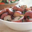 Place the potatoes in a large saucepan with cold water to cover by 2 inches and bring to a boil over medium-high heat. Reduce the heat to medium and cook until the potatoes are tender when pierced with the tip of a knife, 20 to 25 minutes. Drain the potatoes and, when they are cool enough to handle, cut them in half. Transfer to a serving bowl.