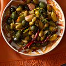 To serve, remove the olives from the refrigerator and bring to room temperature. If you want to serve the mix warm, spoon it into a small sauté pan with some of the olive oil and warm it over the lowest-possible heat. Serve in a small bowl with a few pieces of crusty bread to dip into the oil. Makes about 6 cups.